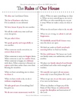 The Rules do not cover everything but they codify, simplify, and post an understandable and easily enforced set of principles every family needs when raising children. For the price of a combo meal, you can post a simple page that will bear relevance to 85% of the daily interaction. It may be the best six dollars you ever spend toward an orderly and peaceful home.